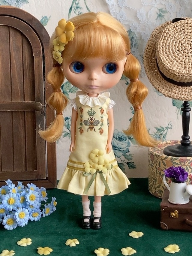 販売終了しました。ありがとうございました^^! レモン色のワンピースと、お花のヘアアクセサリー、ソックスのセットです。 ワンピースは優しいレモン色のリネン生地に、蜂とレモンの刺繍をほどこしました。裾部分には染めたお花とリボンで小さな花束のモチーフを。アクセントになっています♪ ヘアアクセサリーは、お家のなかでもお外でも華やいだ気持ちになっていただきたくて作りました。こちらも可愛いレモン色です♪ 夏の季節にピッタリなワンピースsetです♪ ゆうパケットポストでお届けします。 ※写真のドールや小物は商品ではありません※