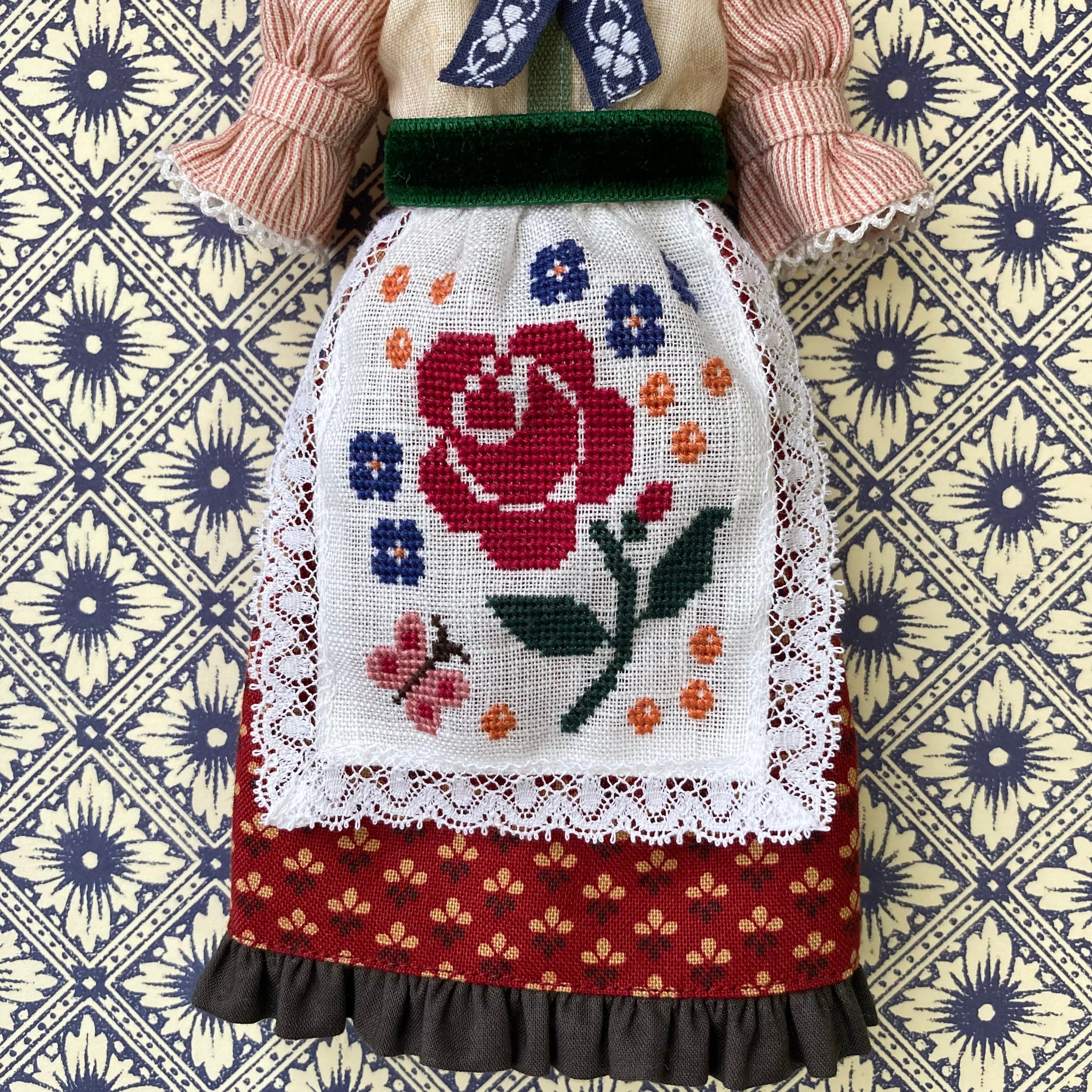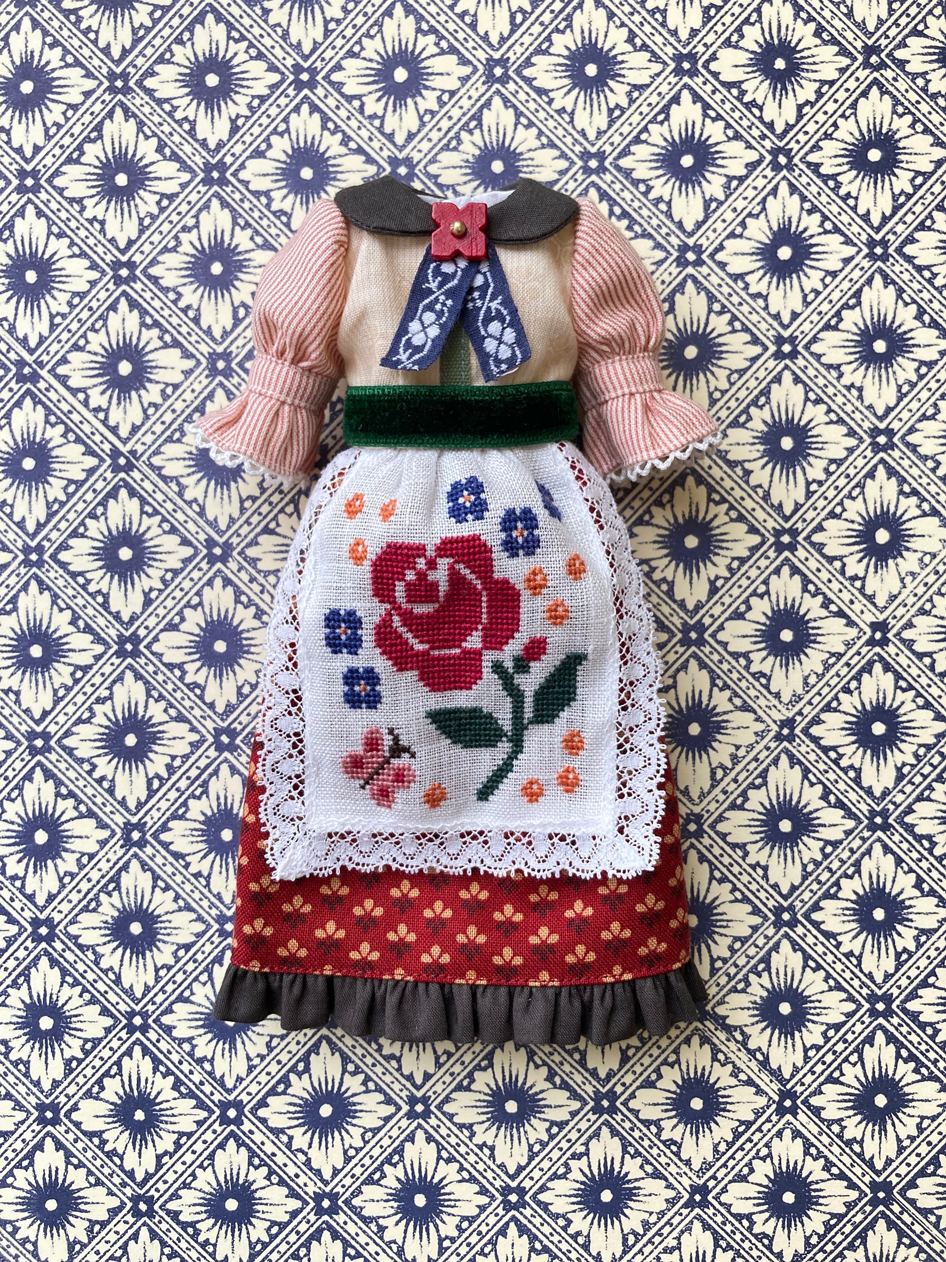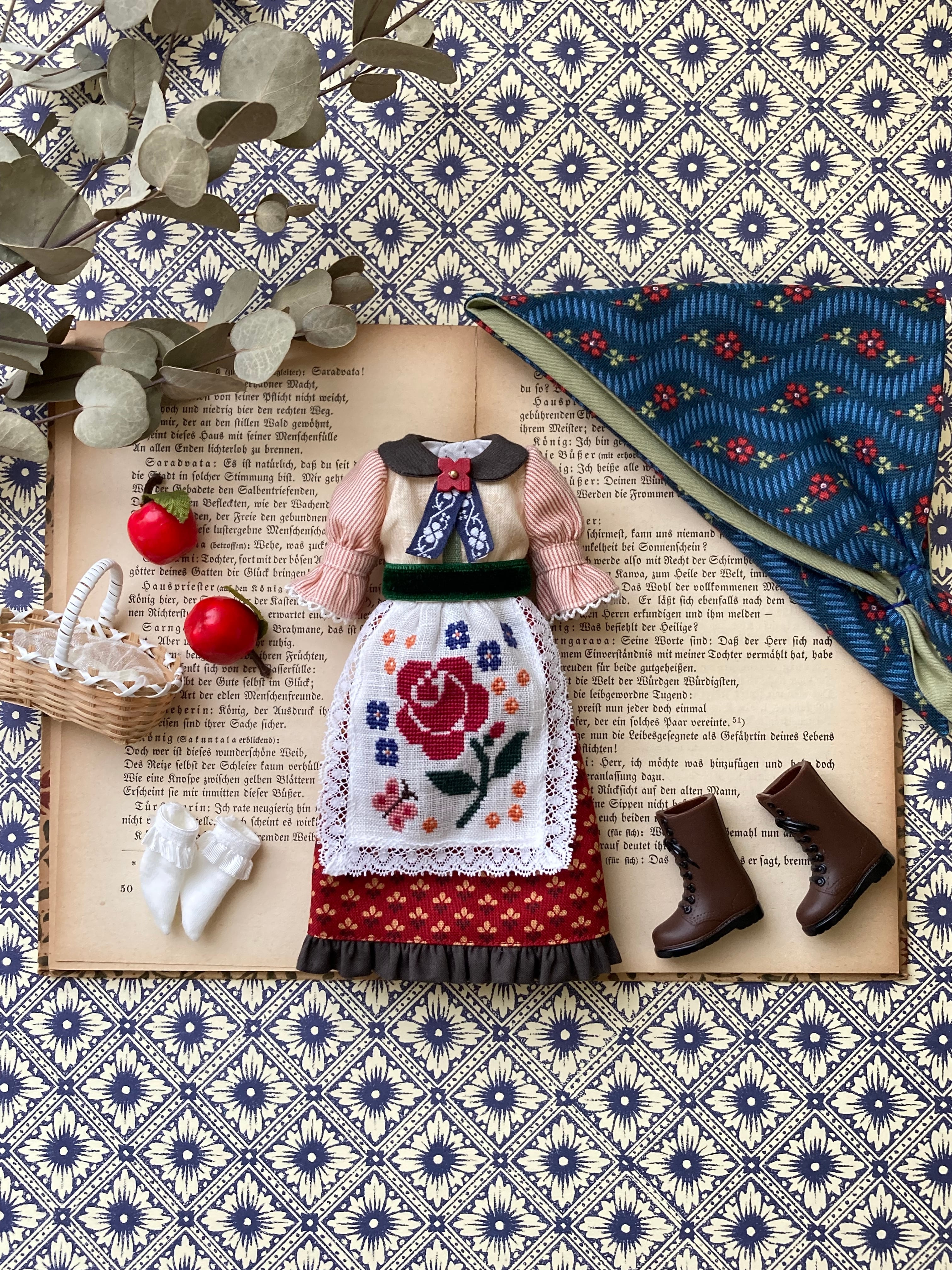 薔薇や蝶々をクロスステッチであしらったエプロンワンピースset。バブーシュカと靴下のセットです。エプロンの周りにはアンティークレースを。ガーリーな仕上がりです♪
