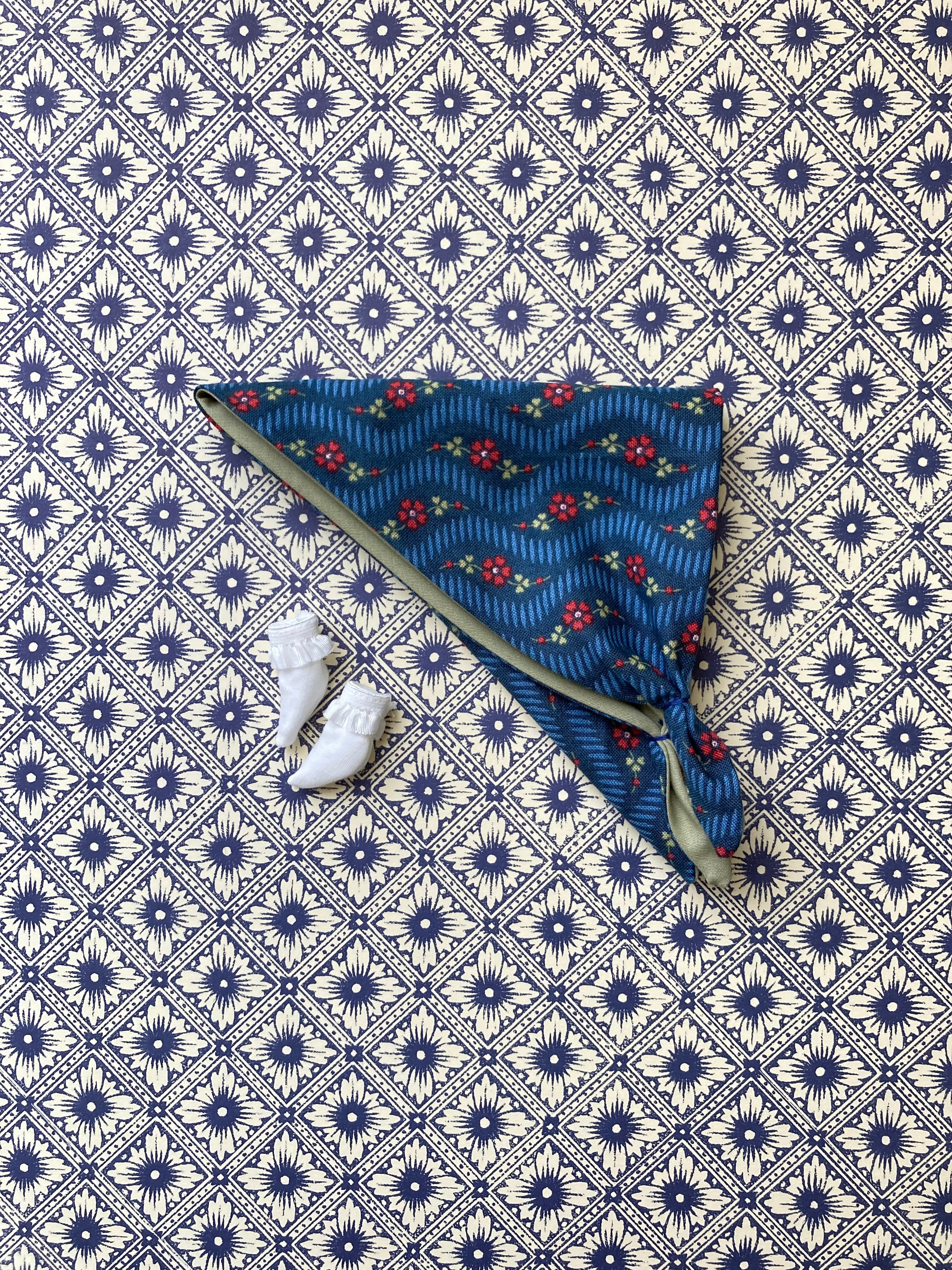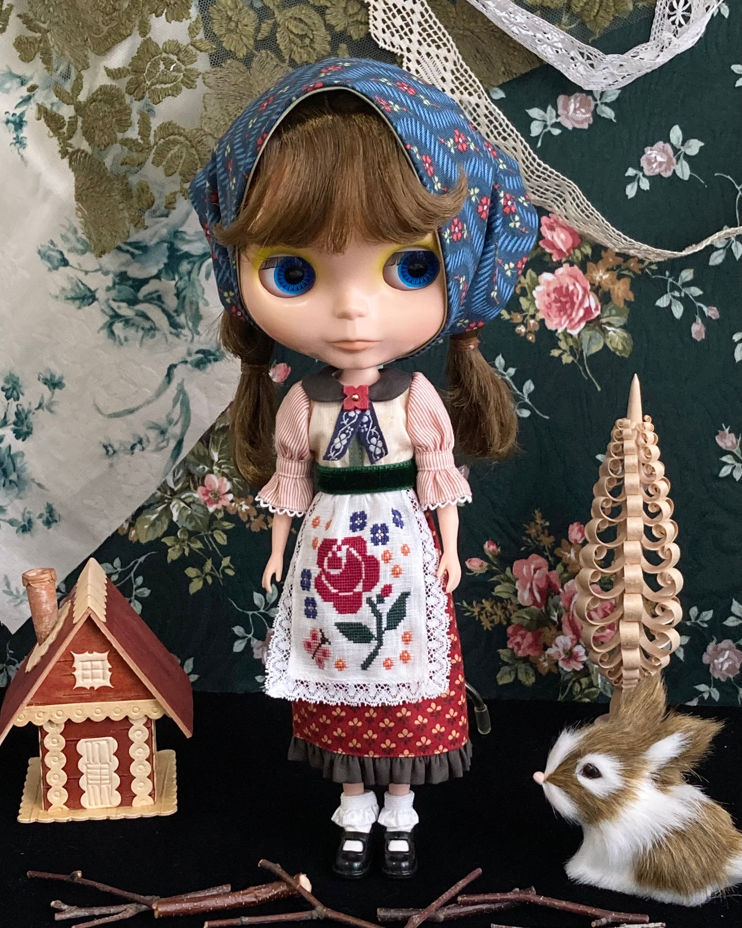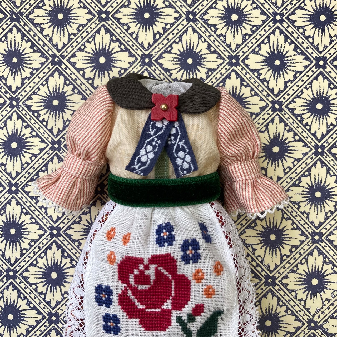薔薇や蝶々をクロスステッチであしらったエプロンワンピースset。バブーシュカと靴下のセットです。エプロンの周りにはアンティークレースを。ガーリーな仕上がりです♪